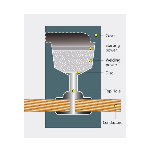 The connection is produced in a purpose-designed graphite mold. The weld employs an exothermic reaction of thermite (powdered metal) to heat the metal. Put simply, the exothermic process involves a chemical reaction that releases heat and requires no external source of heat.